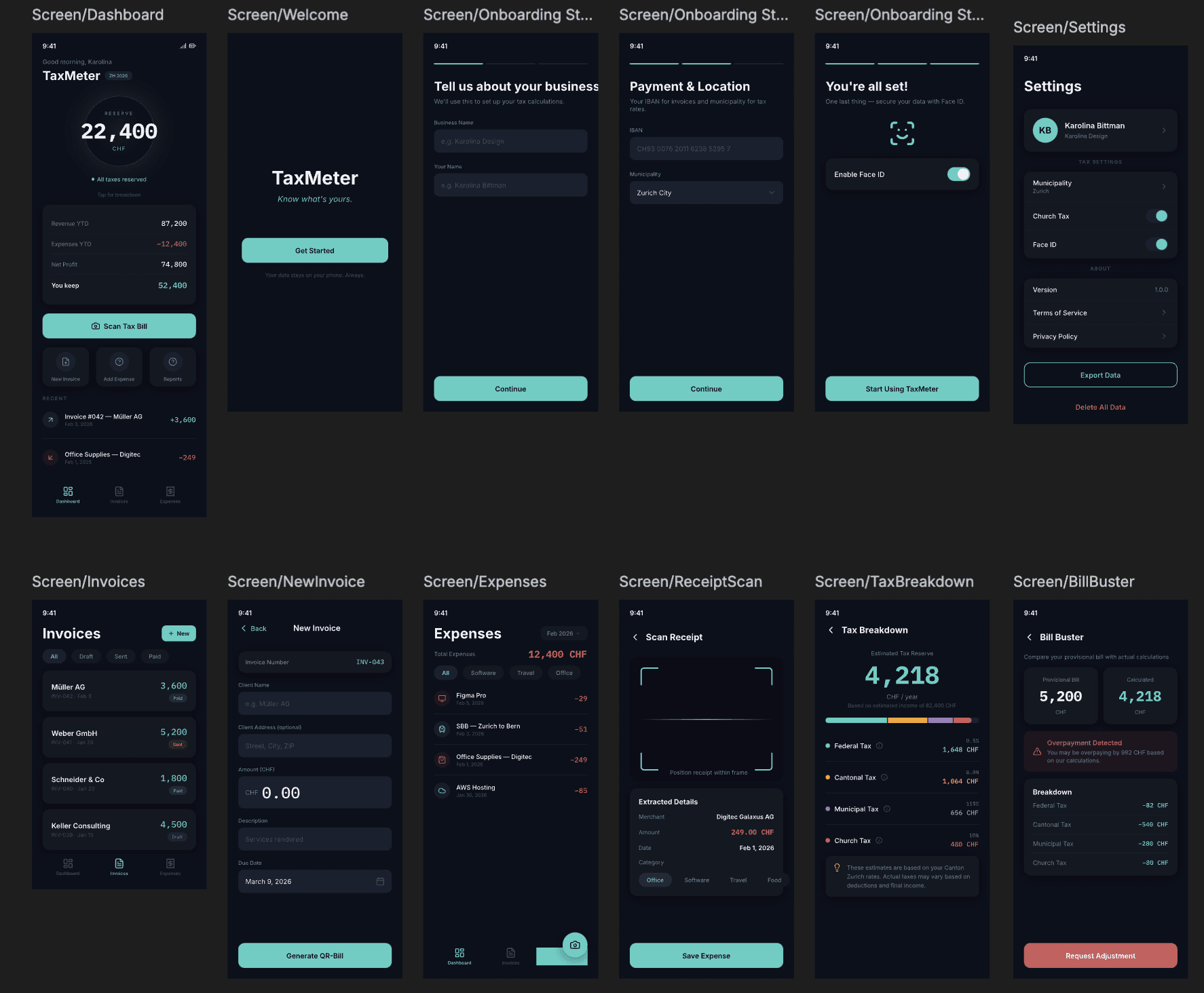 The result was a complete 12-screen blueprint covering every user flow: onboarding with municipality selection, the main dashboard with real-time tax calculations, invoice creation with QR-bill preview, expense tracking with receipt scanning, a full tax breakdown with reserve ledger, and the Bill Buster comparison tool. These wireframes became the direct reference for Claude Code during implementation — the design system tokens, spacing, and component structure were translated into a CLAUDE.md file that guided every line of generated code.