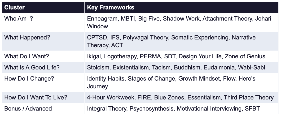 The product is built on **85 psychological frameworks** across 7 clusters — identity, blocks, meaning, philosophy, behaviour change, lifestyle design, and location. Every AI reflection is informed by real frameworks: Logotherapy, Design Your Life, IFS, Polyvagal Theory, the Cashflow Quadrant, Blue Zones, Essentialism.