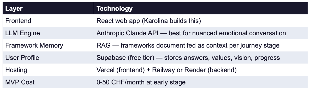 The tools that exist are either too shallow (personality quizzes, Instagram affirmations) or too clinical (therapy, life coaching at €200/hour). There's nothing in between that takes you seriously, uses real psychology, and actually helps you move.