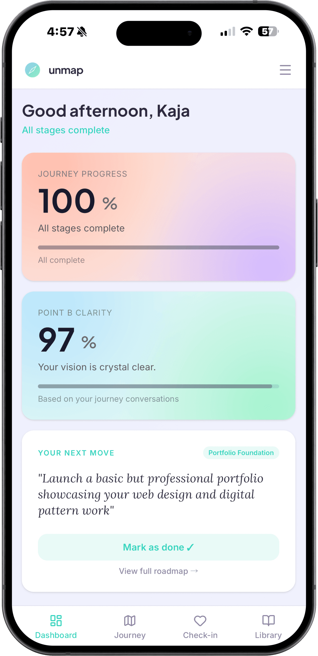 Unmap is a 6-stage personal development web app that guides users through a structured psychological journey — from understanding where they are, to designing the life they actually want.